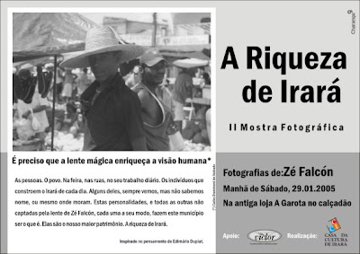 Com uma exposição que mostrava as pessoas de Irará em meio à maior festa popular do município, a festa da padroeira, a Casa da Cultura realizou mais uma etapa de sua atividade. Gratos a todos que contribuíram. Sr. Raimundo Ribeiro pelo espaço, Viva Irará pelas esteiras, Casa do Artesão pelos potes e especialmente ao camarada Zé Falcón. Ele é desses que, como diria o conterrâneo Tom Zé, nasceu com defeito de fabricação e acredita que se apresentarmos a este povo a sua própria fortuna, pode começar a “nascer Jesus Cristo e Fidel Castro pra todo lado”.