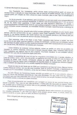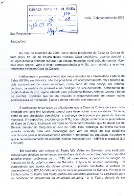 Setembro de 2005. Encaminhei a solicitação à Câmara Municipal de Vereadores. Coloquei anexa, como exemplo, uma carta do ex-prefeito de Salvador, Antônio Imbhassay, datada de 2004. Nela, o executivo, após a ameaça de penhora do Teatro Vila Velha, pedia à Câmara Municipal a aprovação de um projeto de lei para isentar o Vila do imposto. A missiva anexa intencionava exemplificar que não havia impedimento legal para a isenção.