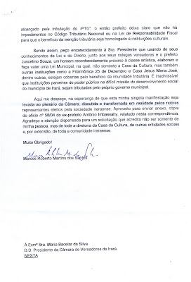 No final daquele mês, veio a confirmação de que o vereador da “reunião informal”, antes da leitura da carta na ordem do dia, havia cumprido o que prometera. Ele afirmou que iria dirigir um requerimento ao prefeito indicando a lei de isenção. E, na edição logo após aquela reunião, o informativo mensal A Gazeta de Irará publicou em suas páginas a notícia de que o vereador havia “pedido isenção de impostos para entidades municipais”.