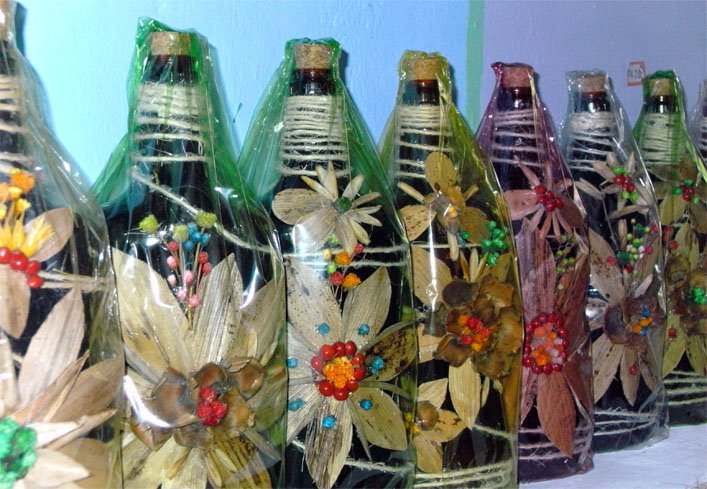 A garrafa é belamente ornamentada com sementes, folhas secas, cordas de sisal ou outros elementos. O recipiente ganha aspecto de obra de arte. Um singelo objeto decorativo para a sua casa; seja na cozinha ou na sala de estar.
