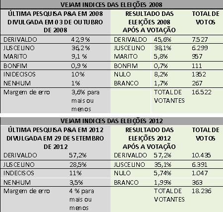 As tabelas acima mostram o nível de acertos das pesquisas eleitorais nas duas últimas eleições aqui em Irará (2008 – 2012).