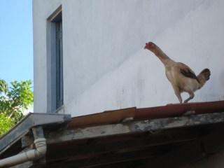 Esta galinha “surtou” e resolveu saltar do quintal para o telhado…