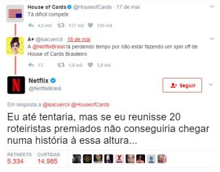 Diante da chamada crise política do Brasil atual, o perfil do twitterdo House Of Cards, série do Netflix, certamente inspirada no modus operandi da política estadunidense, desabafou: “tá difícil competir”. E o perfil da Netflix interagiu: “Eu até tentaria, mas se eu reunisse 20 roteiristas premiados não conseguiria chegar numa história a essa altura”.